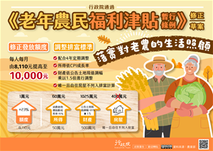 為落實照顧農民老年生活,行政院通過《老年農民福利津貼暫行條例》修正草案,修正重點包括發放額度每人每月調整至1萬元,並調整排富標準。行政院新聞傳播處特策製旨揭說明資料,請參閱。