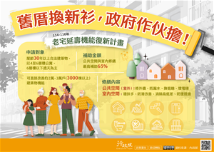 為解決國內老宅空間機能不足、無障礙設施缺乏、管線老化及高齡者居住不便等問題,政府推動「老宅延壽機能復新計畫」(114-116年),透過補助公共空間與室內修繕,改善老宅機能,讓人民安心穩居。行政院新聞傳播處特策製旨揭說明資料,請參閱。